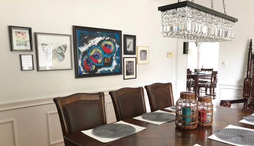 Using the right light fixture reveals the beauty in a room. Mixing up styles looks great and adds interest. Combined with pot lights and adding dimmer switches, this dining room offers the perfect lighting for an intimate dinner or after dinner board games.